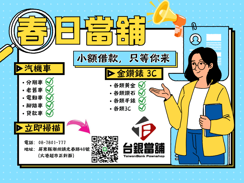 生活中肯定像鐘小姐這樣的人大有人在,但是像鐘小姐這樣有商業頭腦的人也許並不會很多,其實生意失敗這是暫時的,如果你缺乏手頭的資金週轉,可以像鐘小姐一樣選擇台銀小額借款。臨時周轉需要選擇正確的春日網友一致推薦的實體店家,這樣一定會給你帶來生意上的幫助,也會解決資金週轉的難題,讓每一位想要東山再起的朋友都能夠像鐘小姐一樣。有借有還再借不難,想要資金週轉的朋友們不要誤入歧途,被非法管道業者以話術來陷入陷阱。若有小額借款需求,不論是汽機車借款、金鑽錶3C借款等…都是可以選擇台銀來辦理。台銀的每一位工作人員都會為每一位客戶制定專屬的借還款方案,達到每一位客戶的需求!想做小額借款,現在就撥打合法春日台銀當舖服務專線: 08-7801777了解,或立即線上Line聯繫台銀金融專員,手機輸入ID:15888(你我發發發),真心熱忱為您服務,請給我們一次服務的機會